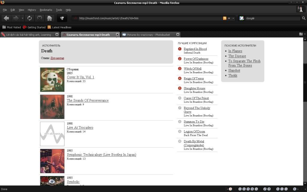 Các bạn có thể tìm kiếm ca sÄ© theo thứ tá»± chữ cái hay thể loại nhưng cách tốt nhất là gõ vào trong ô tìm kiếm cá»§a nó. Ví dụ: Tui gõ vào từ Death, kết quả tìm kiếm sẽ hiện ra ngay phía dưới ô search . Click vào tên ca sÄ© mà bạn sắp hốt album vá», á» Ä‘ây tất nhiên là band Death rồi (các kết quả đầu tiên là giống vá»›i ná»™i dung bạn muốn tìm nhất).
