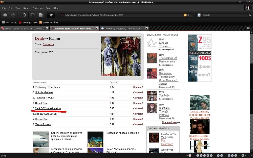 Tiếp đến nó sẽ hiện ra danh sách má»™t loạt các album cá»§a Death. Tui nghe ai Ä‘ó nói rằng bài Lack of comprehension nằm trong album Human nên tui sẽ click vào Human.